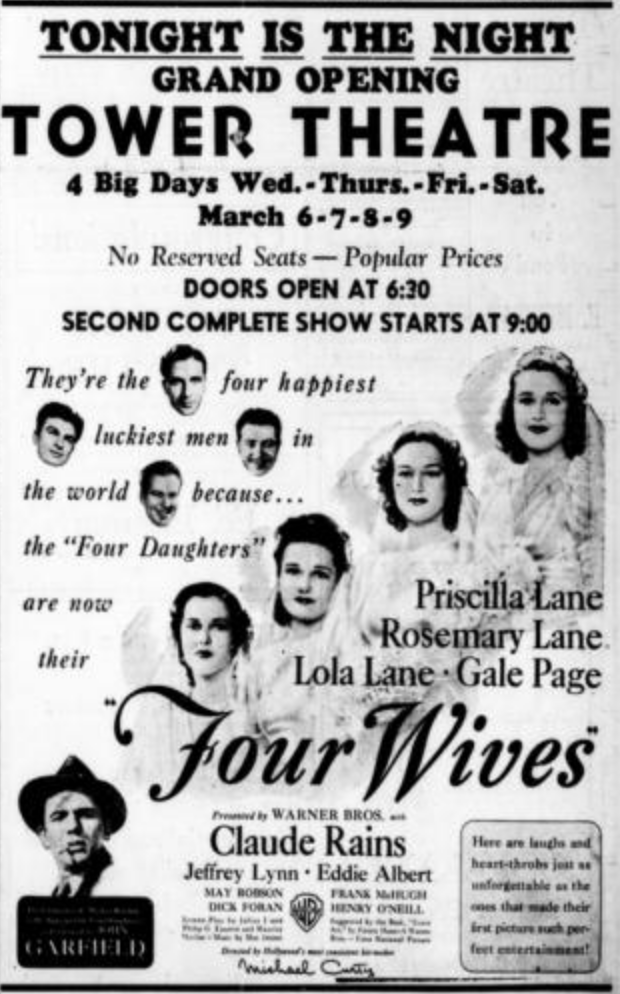 The Tower Theatre opened on March 6, 1940, which was a Wednesday. Managers Ken Hodkinson and Frank Blount focused on showing movies during Sundays, Mondays, and Tuesdays at first. Even though opening night was not on this schedule, it was still very successful with the showing of Four Wives. The film was made by Warner Bros, where there were ties with these big companies because Ken Hodkinson was the son of W.W. Hodkinson, one of the founders of Paramount Pictures. During the early opening years, Ken Hodkinson announced they will provide first run pictures with four different services, Columbia, RKO, Monogram and Warner Bros. These big names brought in many audiences from not only around central Oregon, but from around the state, as well. Even on opening night, crowds were huge with over 900 seats originally. With ties to such companies like Paramount, Tower Theatre was able to show many big name movies and other forms of media like cartoons and sports because of how well supported it was. It was able to show Disney cartoons and other things that usually supplemented the movie shown that evening. With these other forms of media, like fight nights, Christmas shows, fashion shows, and more, the Tower Theatre suddenly became a space of more than just moviegoing, especially now. Today, it is more of a performing arts center rather than a single screen theater. A BendFilm site is used at the theater now, which is still bringing in state-wide crowds on opening nights, yet is bound to be smaller as there are only 400 seats after the renovation that happened in 1997.